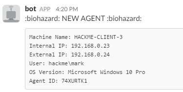 The ‘Slack’ configuration has also been configured so that notifications will appear in our chosen Slack channel when agents are established.