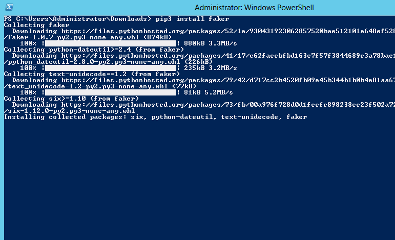 Once Python3 has been successfully installed we need to install the “faker” python library by issuing the following command from a command shell/powershell instance.