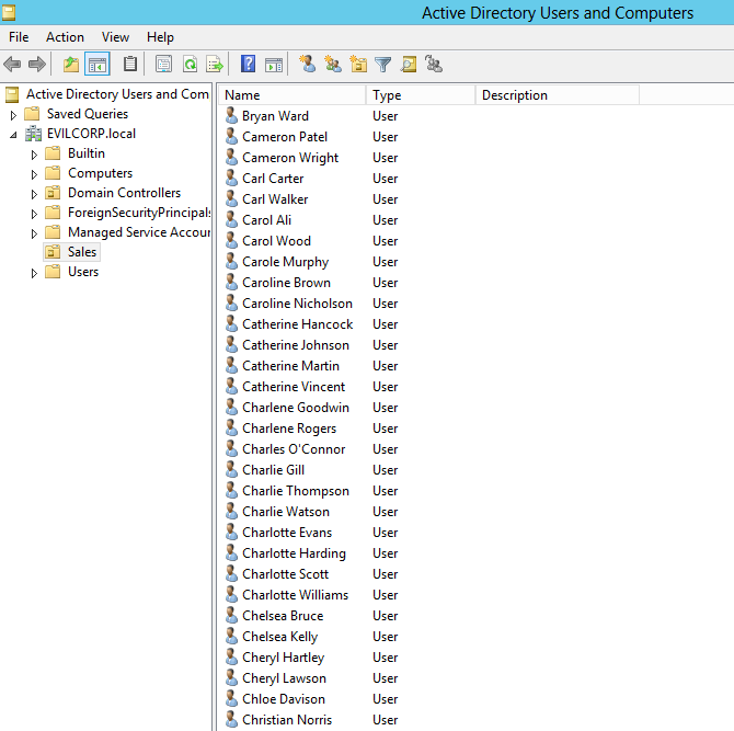You now need to create those virtual employees within Active Directory. Creating a few different accounts here and there is a relatively easy task I agree, but what if you want your virtual organisation to consist of hundreds of different users in different departments or organisational units, especially with real–world passwords? Having an Active Directory full of users can be useful for a number of activities one being the extraction of NTDS.dit and practising cracking techniques on any hashes that it may contain.