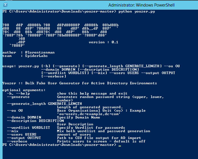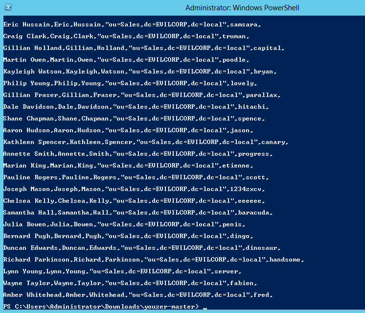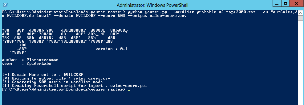 PS C:\Users\Administrator\Downloads\youzer-master\> python youzer.py --wordlist probable-v2-top12000.txt --ou "ou=Sales,dc=EVILCORP,dc=local" --domain EVILCORP --users 500 --output sales-users.csv