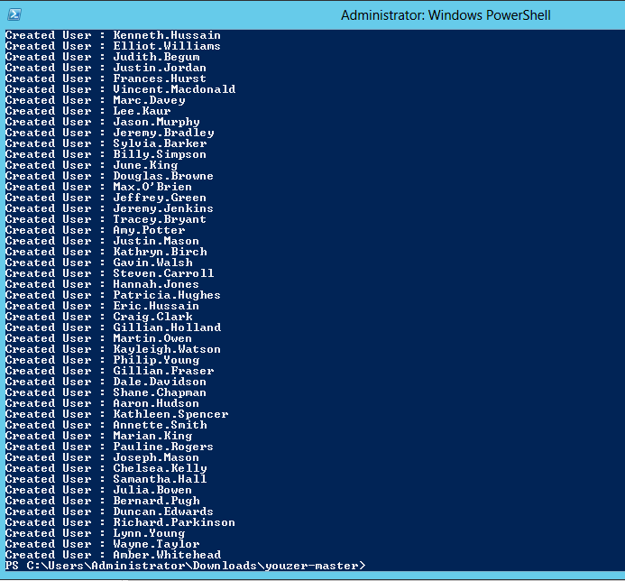 Now our users have been generated and the needed files created we can go ahead and launch the PowerShell script which Youzer created for us in order to populate our Active Directory.