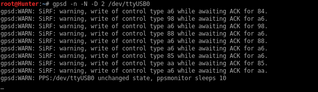 root@hunter~# gpsd -n -N -D 2 /dev/ttyUSB0
